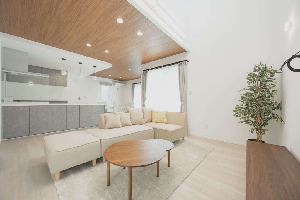 下がり天井がポイントのLDK。キッチンからでもリビングの様子が伺えます。